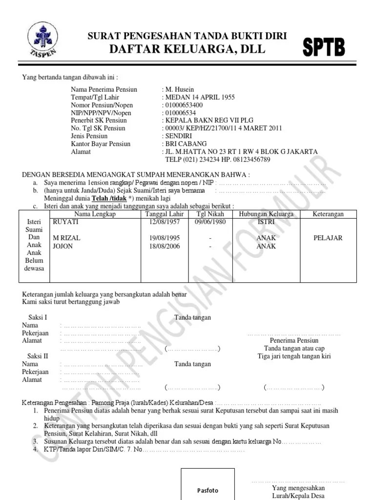 Surat keterangan janda/duda yang telah di isi dan disahkan oleh serendah rendahnya kepala kelurahan/kepala desa + 1 lembar foto copynya; Asli tembusan sk pensiun berpasphoto untuk pt. Formulir pengajuan 8 surat keterangan pembayaran terakhir dari kantor bayar: Surat keterangan kejandaan asli dari lurah (2 lembar). Surat pernyataan tanda bukti diri (sptb) (keterangan yang berhak menerima pensiun) yang bertandatangan dibawah ini : Contoh surat keterangan berstatus janda ditinggal mati suaminya yang. Contoh formulir surat keterangan janda duda. Pt asabri (persero) jakarta jl. Contoh surat permohonan pensiun pns. Apabila suami/isteri dari pns juga sudah meninggal namun masih mempunyai anak yang berhak menerima pensiun maka dilampirkan pas photo anak ybs. Contoh surat kuasa pengambilan yang benar. * surat kenal lahir/akte kelahiran bagi anak yang lahir setelah pensiun. 10 contoh surat keterangan untuk berbagai keperluan.
