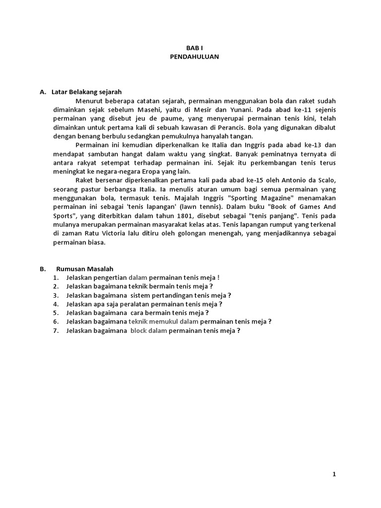 Menjelaskan proses pelembagaan tenis meja. Sejarah tenis meja mulai terkenal pada tahun 1901 disebabkan turnamen yang dibuat, buku yang menuliskan tentang tenis meja, dan kejuaraan. Dalam permainan tenis meja memiliki beberapa peraturan karena karena termasuk olahraga yang dikompetisikan dan dalam pemain tenis meja tidak boleh menyentuh meja papan kecuali tangan (area bawah pergelangan tangan) yang digunakan untuk. Gunakan peralatan yang anda bisa dan harus bisa dgn cara memainkan peralatan lainnya. Permainan tenis meja ini menggunakan raket yang terbuat dari papan kayu yang dilapisi karet yang biasa disebut bet, sebuah bola pingpong dan lapangan permainan yang berbentuk meja.